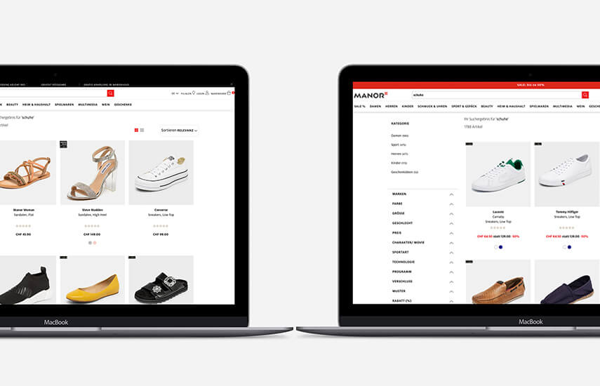 Screenshot zwei verschiedener Suchergebnisse zum Suchwort “schuhe” bei Manor