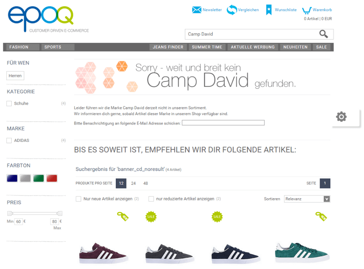 Die bisher betrachteten Strategien zielen alle auf Suchanfragen zu Produkten oder Beiträgen ab, die im Shop prinzipiell verfügbar sind. Es gibt aber natürlich auch Suchanfragen zu Artikeln, die nicht im Sortiment geführt werden, z. B. bestimmte Marken, Saisonartikel oder Trends. Für genau solche Suchanfragen ist die Null-Treffer-Seite gemacht und die Weiterleitung darauf muss daher auch nicht vermieden werden. Trotzdem sollte man den Besucher nicht als verloren ansehen, auch wenn der Suchbegriff nicht optimal zum Online Shop passt. Ganz im Gegenteil: Die Null-Treffer-Seite kann auch für den Online Shop arbeiten, indem sie mit epoq individuell an die Suchanfrage angepasst wird. Mit einem Empfehlungswidget können dem Suchenden Alternativen zur Suchanfrage gegeben und ihn so im Online Shop gehalten werden. Die Marke Camp David ähnelt zum Beispiel der Marke La Martina, Ugg Boots gibt es auch von vielen anderen Marken und Karnevalkostüme können mit 20er Jahre Kleidern, Pünktchenröcken und Dirndl dargestellt werden. Einen überzeugenden Erklärungstext (z.B. in einem Banner) dazu und schon wird der Kunde inspiriert und vom Online Shop überzeugt.