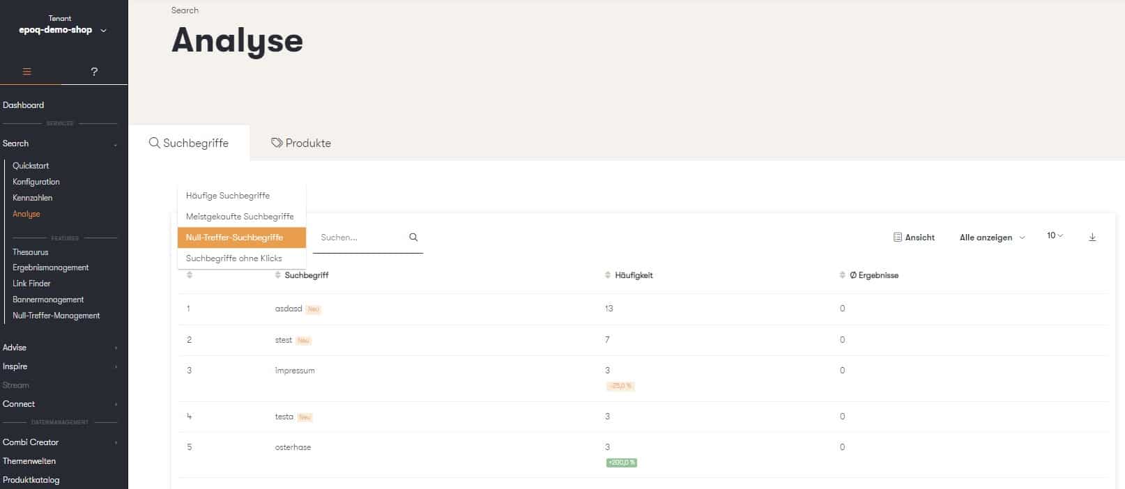 Der erste Schritt sollte sein, herauszufinden, welche Suchbegriffe Null-Treffer-Seiten auslösen. Die passende Auswertung dazu gibt es im epoq Control Desk. Im Analysebereich der Suche unter dem Punkt „Analyse Suchbegriffe“ (Reiter: Null Treffer) sind folgende Reportings zu finden: