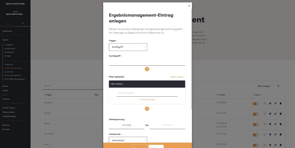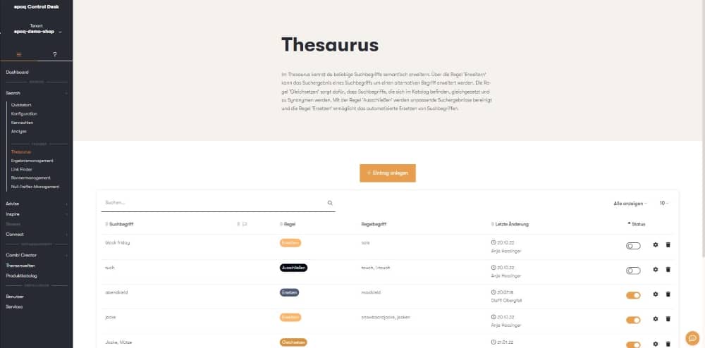 Weißt du, was ein “Tornister” ist? Nein? Deine Kunden vielleicht schon. Und suchen genau danach, anstatt nach einem Schulranzen. Ergebnis: Sie finden sich auf der Null-Treffer-Seite wieder, obwohl doch hunderte Schulranzen im Sortiment sind. Um genau das zu vermeiden, gibt es bei epoq die Thesaurus-Funktion. Sie ist im Bereich Search zu finden. Zur Auswahl stehen fünf verschiedene Thesaurus-Regeln zur Verfügung: Gleichsetzen, Erweitern, Ausschließen, Ersetzen und Null-Treffer. Bei Gleichsetzen-Einträgen werden jeweils die Suchergebnisse von beiden eingetragenen Begriffen angezeigt, egal nach welchem gesucht wird. So wird zum Beispiel das eben beschriebene Tornister-Schulranzen-Problem gelöst. Sollen dagegen Ergebnisse für bestimmte Suchbegriffe ausgeschlossen werden, hilft die Ausschließen-Regel weiter. Hiermit können zum Beispiel alle Produkte zum Begriff „Serum“ (z.B. Hautcremes) bei der Sucheingabe des alkoholischen Getränks „Rum“ ausgeschlossen werden. Weitere Beispiele und Erklärungen zur Erweitern-, Ersetzen und Null-Treffer-Regel haben wir im Control Desk im Thesaurus-Eingabemenü integriert.