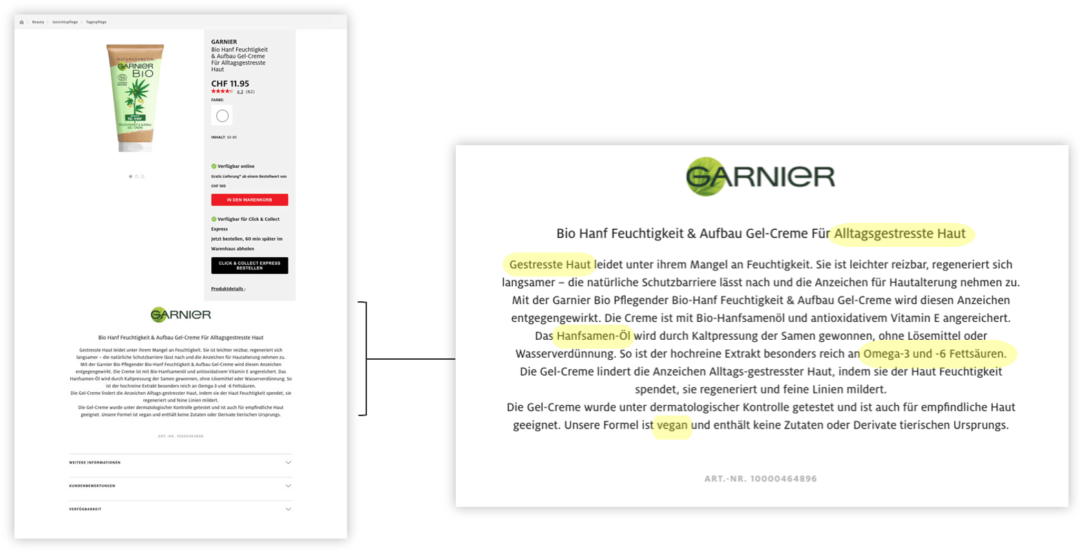 Auch außerhalb des Modebereichs verstecken sich interessante Eigenschaften häufig im Text, wie bestimmte Inhaltsstoffe, der Hauttyp oder die Eigenschaft „vegan“ bei der dargestellten Bio-Creme.