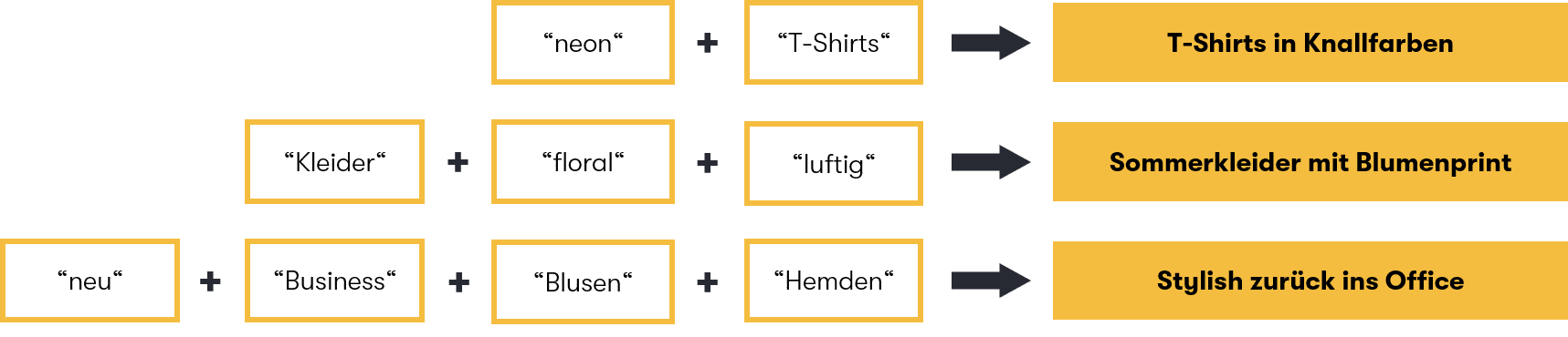 Beispiel: Die Eigenschaften „Neue Produkte“, „Business“, „Blusen” und “Hemden“ lassen sich zu einer neuen künstlichen Kategorie mit dem Thema „Stylish zurück ins Office“ zusammenführen.