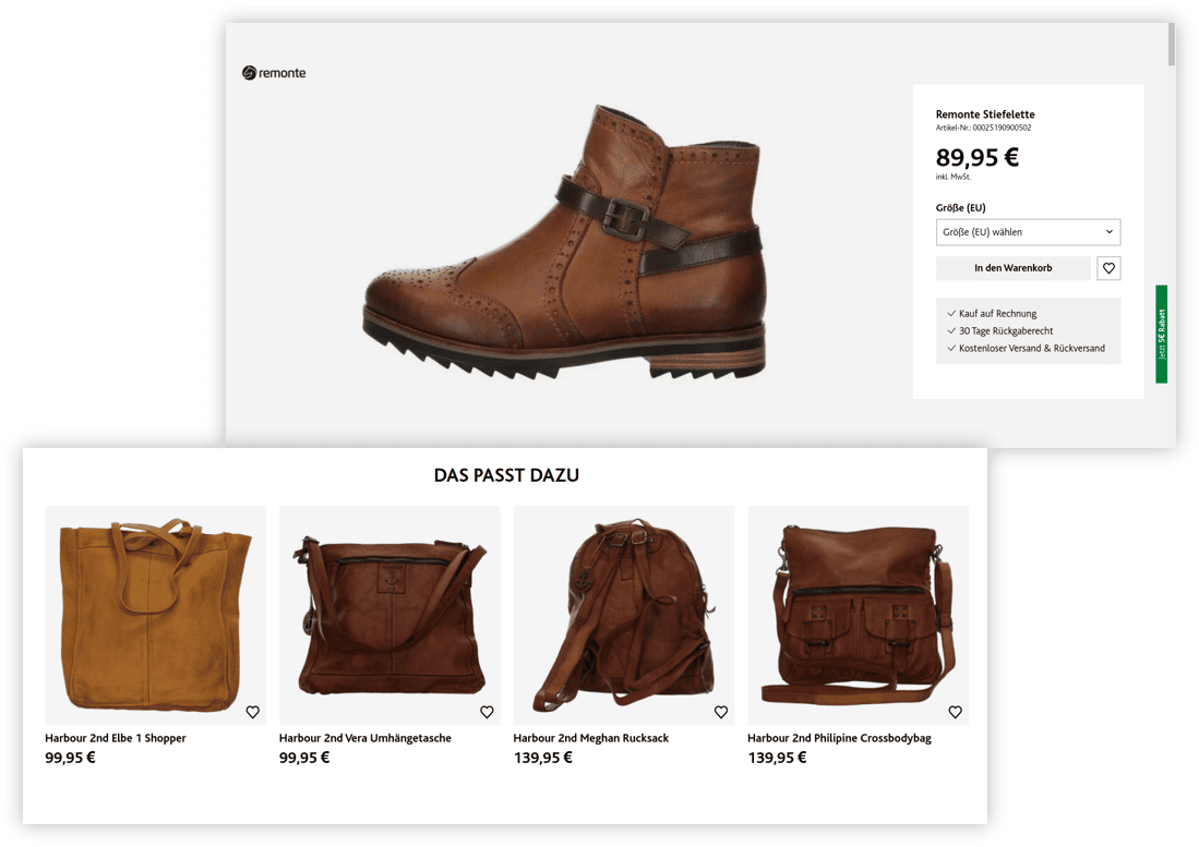 Auch für Zusatzartikel, wie passende Taschen zu einem angeschauten Schuh, spielen die gepflegten Attribute eine zentrale Rolle. Je mehr Attribute dabei zur Verfügung stehen, desto besser werden die Empfehlungen. Somit haben diese einen wichtigen Anteil an der Personalisierung. Wurde innerhalb einer Session erkannt, dass ein Shopbesucher Interesse an einem bestimmten Stil (z. B. Western / Biker) hat, kann dies dank der vorliegenden Eigenschaften entsprechend für die Ausspielung der empfohlenen Zusatzartikel berücksichtigt werden.