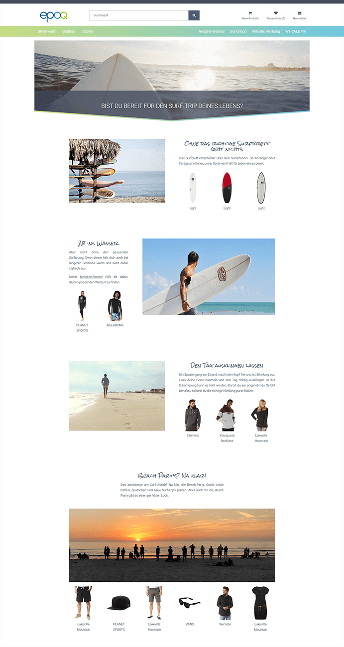 Beispiel einer Content-Seite mit Produktempfehlungen rund um das Thema ‘Surf-Trip’