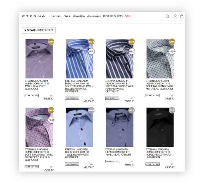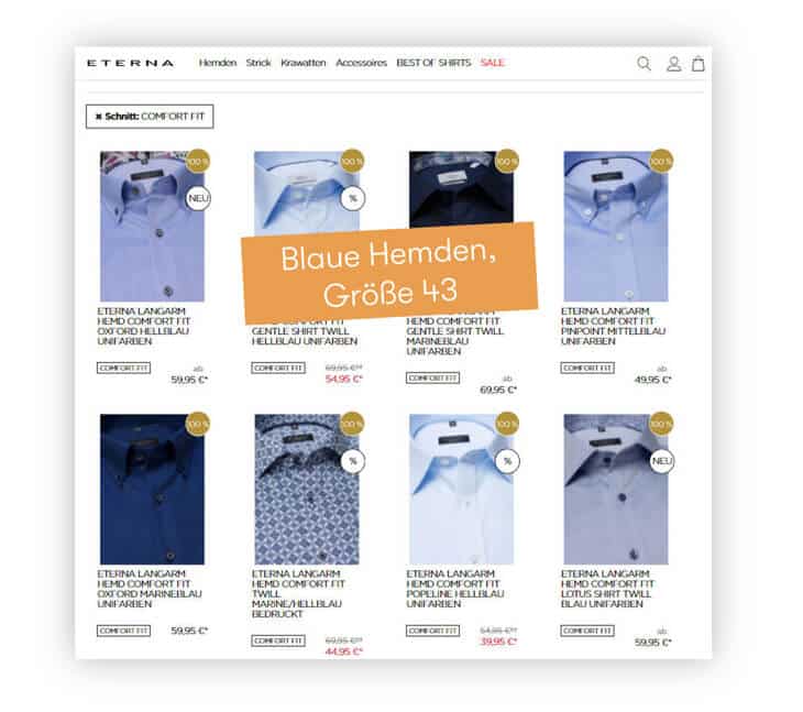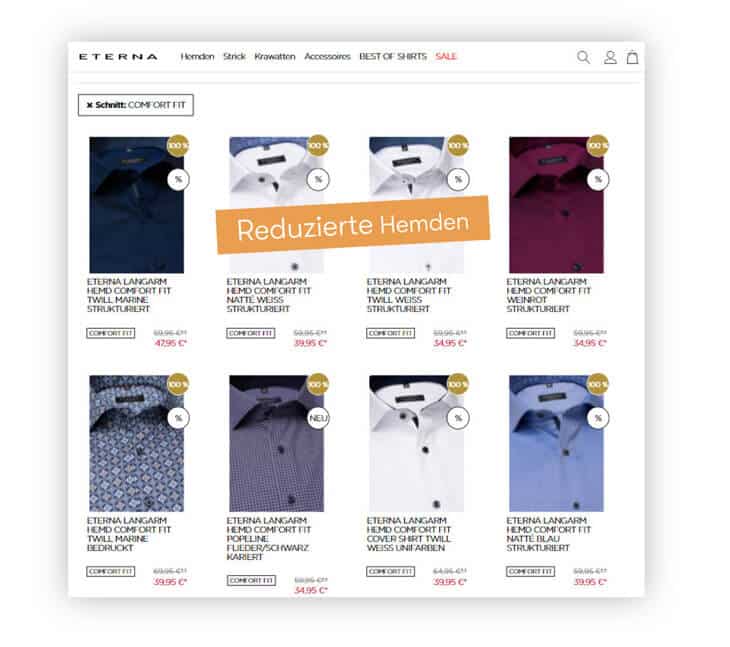 Die Ergebnisse werden Segment-basiert ausgespielt (z. B. Reduzierte Hemden für “Schnäppchenjäger”) (Quelle: Screenshot von eterna.de)