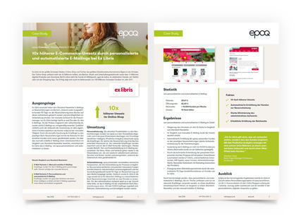 Ex Libris steigerte gemeinsam mit epoq den E-Commerce-Umsatz über personalisierte und automatisierte E-Mailings mittels KI. Ex Libris informiert hierfür ausgewählte Kunden 90 Tage im Voraus über eine Buch-Neuerscheinung und bietet die Möglichkeit zur Vorbestellung an.